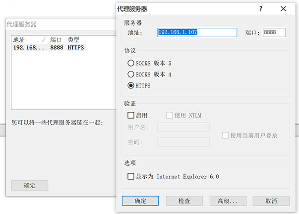 在Proxifier中添加[192.168.1.107:8888]这个Fiddler提供的HTTPS代理服务器