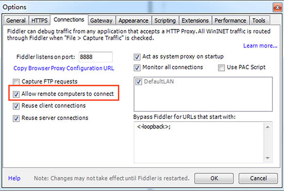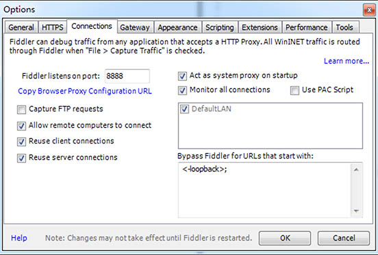 首先打开选项确认Fiddler在8888端口提供HTTP/HTTPS代理服务。