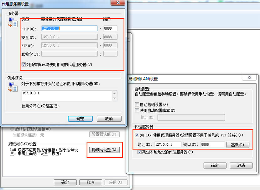 进入Windows代理设置,位于[Internet 选项] — [连接] — [局域网设置] — [高级]中设置代理[127.0.0.1:8888]