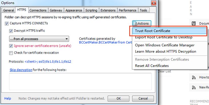 在Fiddler中点击[Tools] — [Options] — [HTTPS]勾选如下设置: