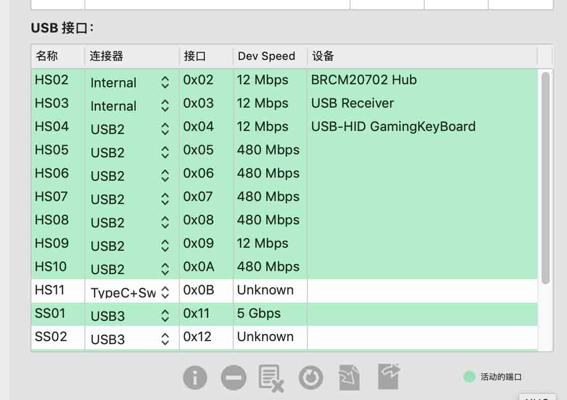 注意:macOS系统的USB端口数量为15个,所以我们要保证USB端口数量要在15个及以内,USB3.0要占用两个端口,操作时,UBS3端口要拿一个USB3设备插入一次,一个2.0设备插入一次,记录下来