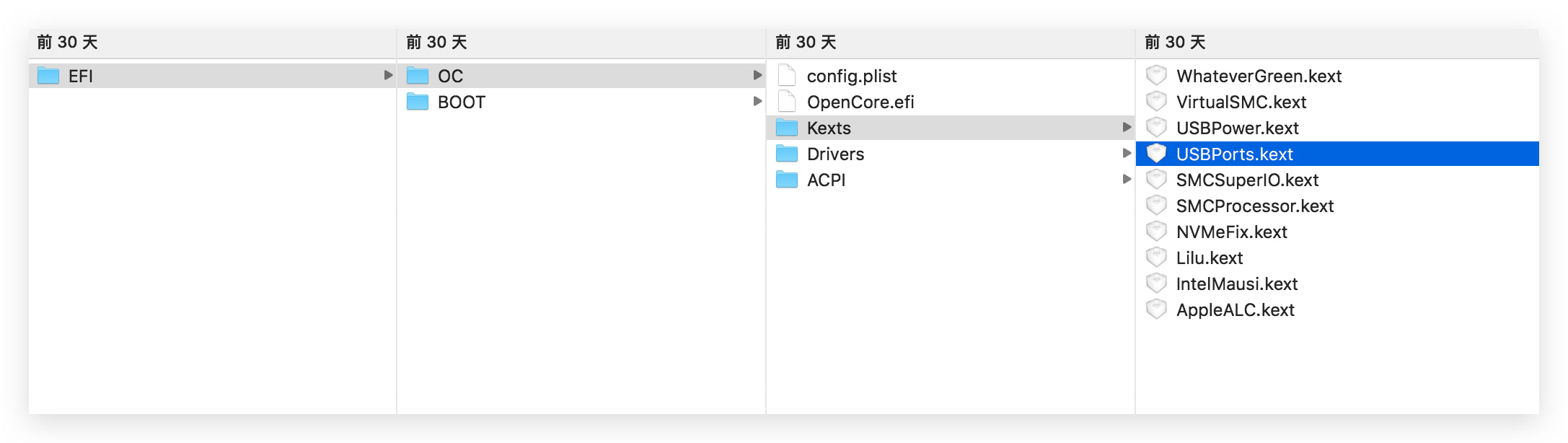 定制完后导出,一共有四个文件,一个是USBPorts.kext,放入OC的Kexts文件夹。