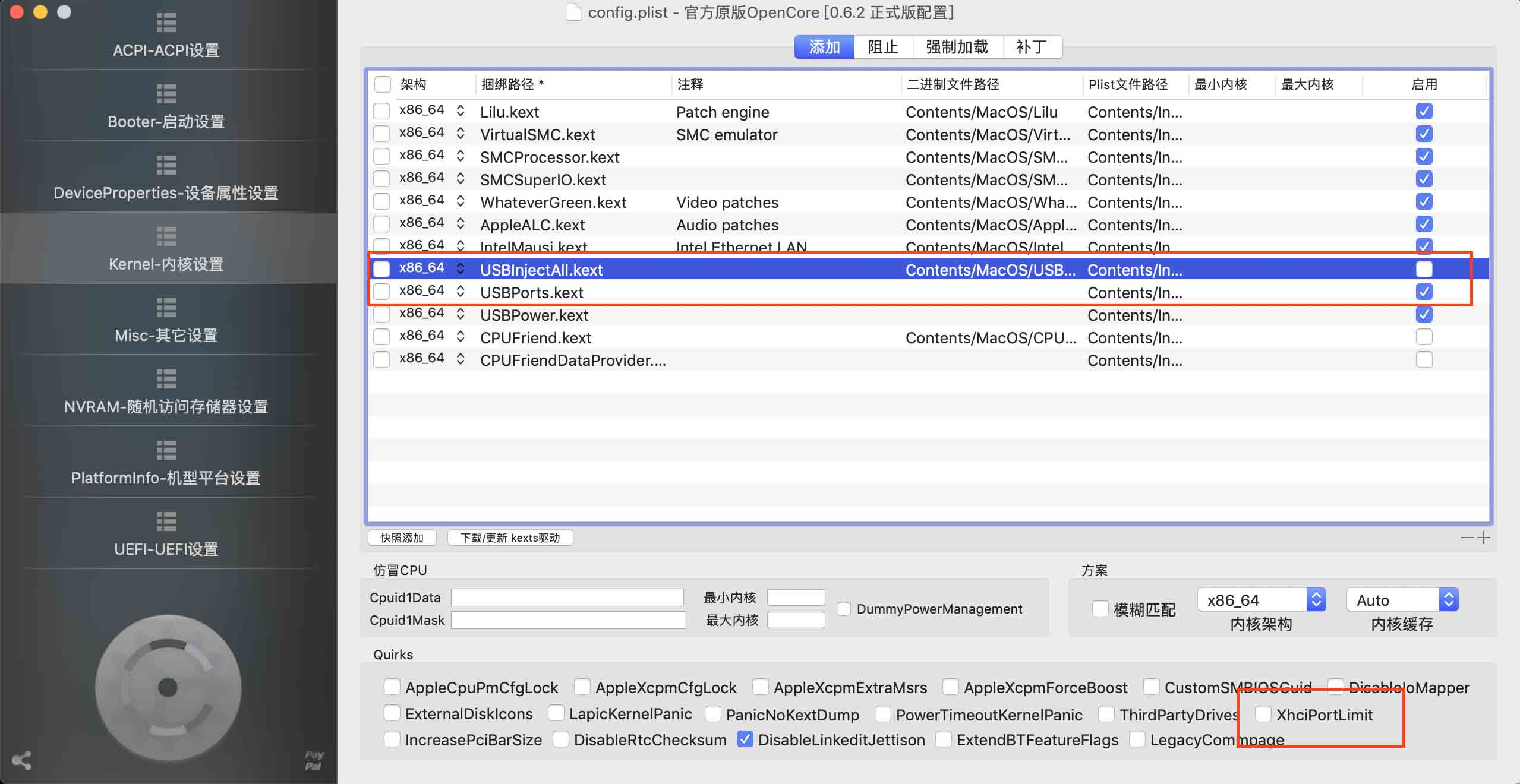 在OpenCore Configurator里添加进去我们定制的kext并启用,关闭XhciPortLimit,禁用USBInjectAll.kex,保存OpenCore Configurator